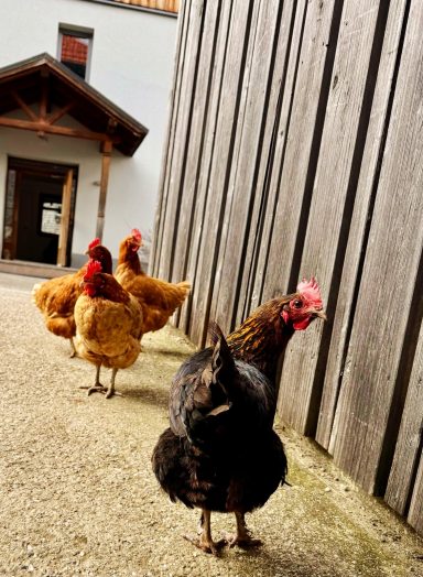 16 Hühner, die täglich frische Frühstückseier legen. Sag auch Hallo zu unseren Fischen Redhead, Rodrigez und Sanchos, die ihre Runden im hauseigenen Teich drehen.